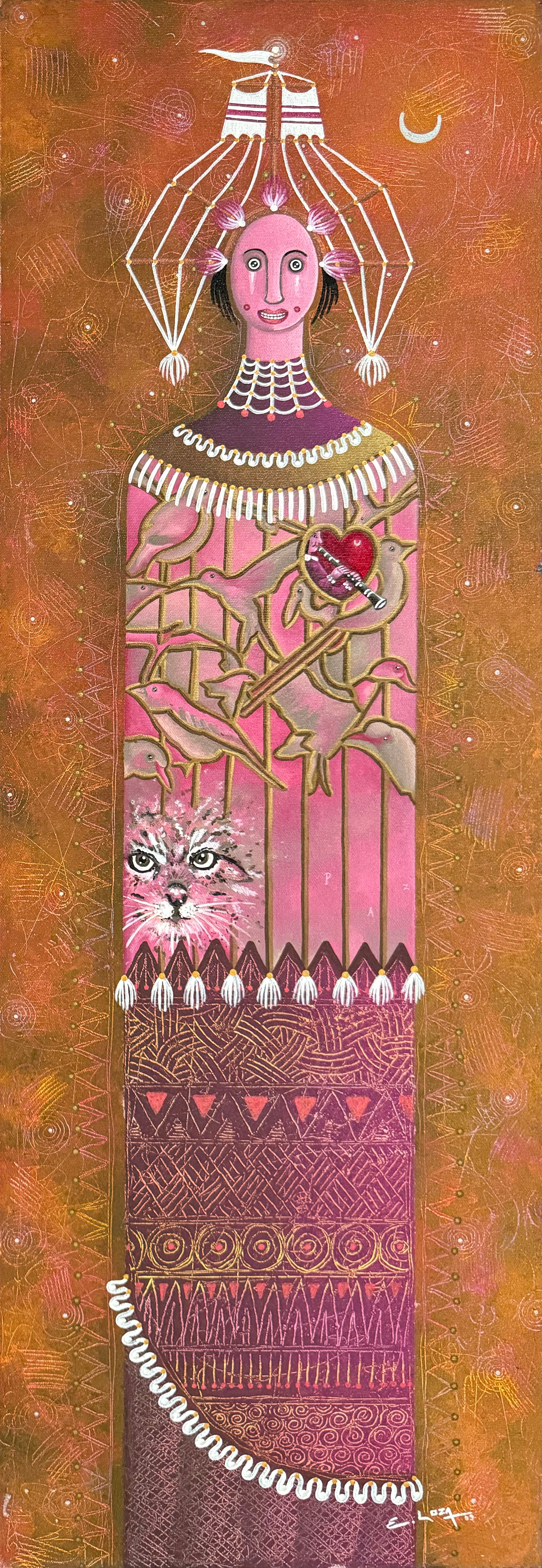 LOTE 042 / Enrique Loza - Chaman con aves 4 / Acrílico sobre tela - 90 x 30 cm